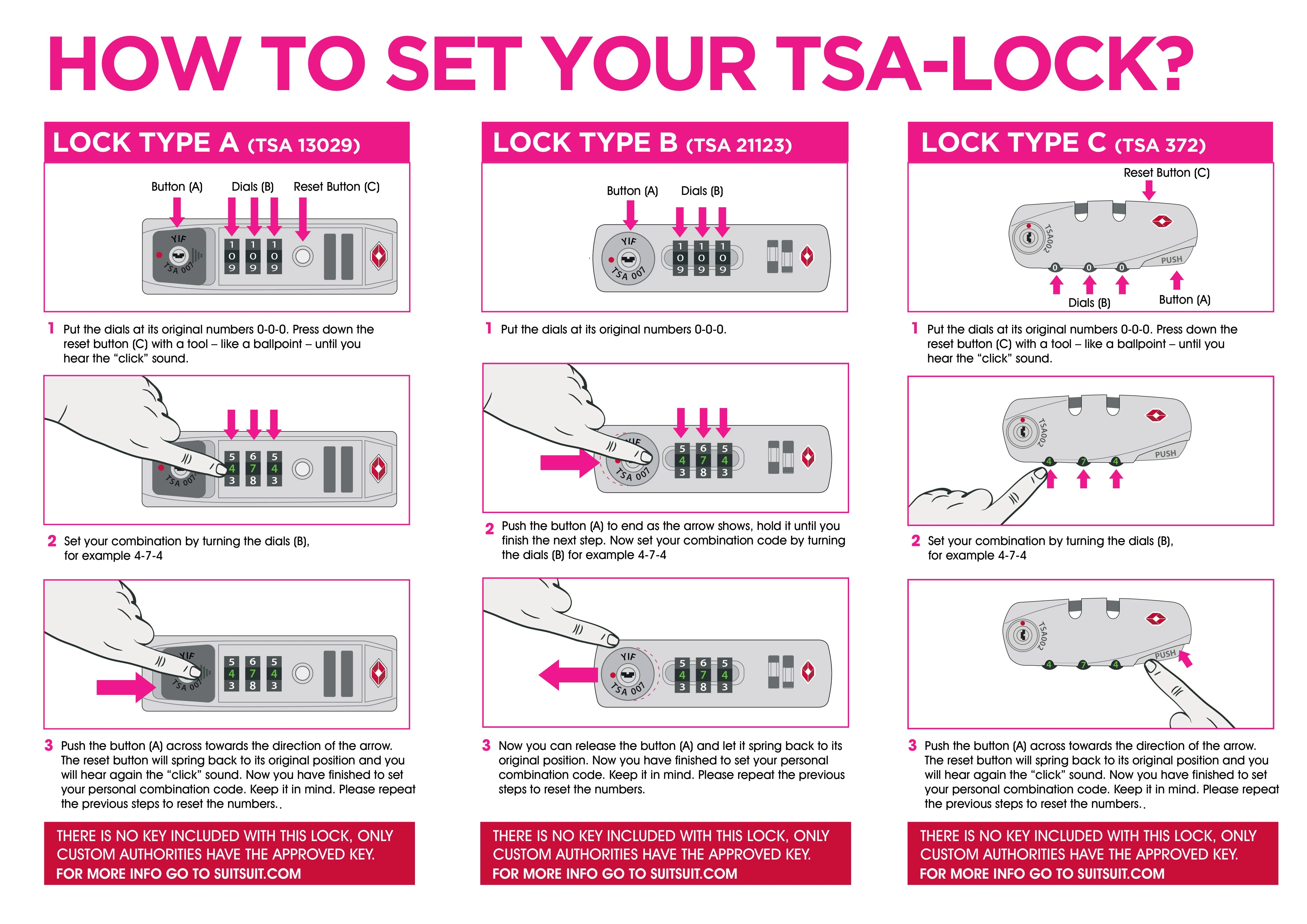 You can set your lock in a few simple steps. But first, you have to determine what type of lock is placed on your suitcase. To get an overview of all kinds and ‘flavours’ of locks we currently have, please watch the video below. You can also view the description in the PDF and (possibly) print it out. It comes in handy when you want to reset your lock.
